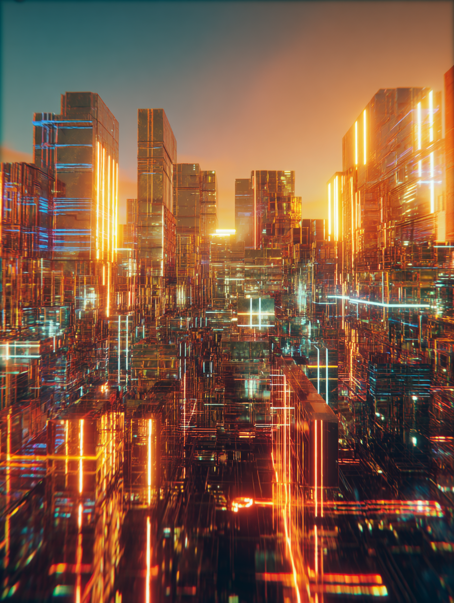 “夕阳映照下的未来城市天际线,璀璨霓虹在玻璃幕墙上交相辉映,结合电影级光效与超精细质感,通过广角镜头捕捉宏大视觉。”