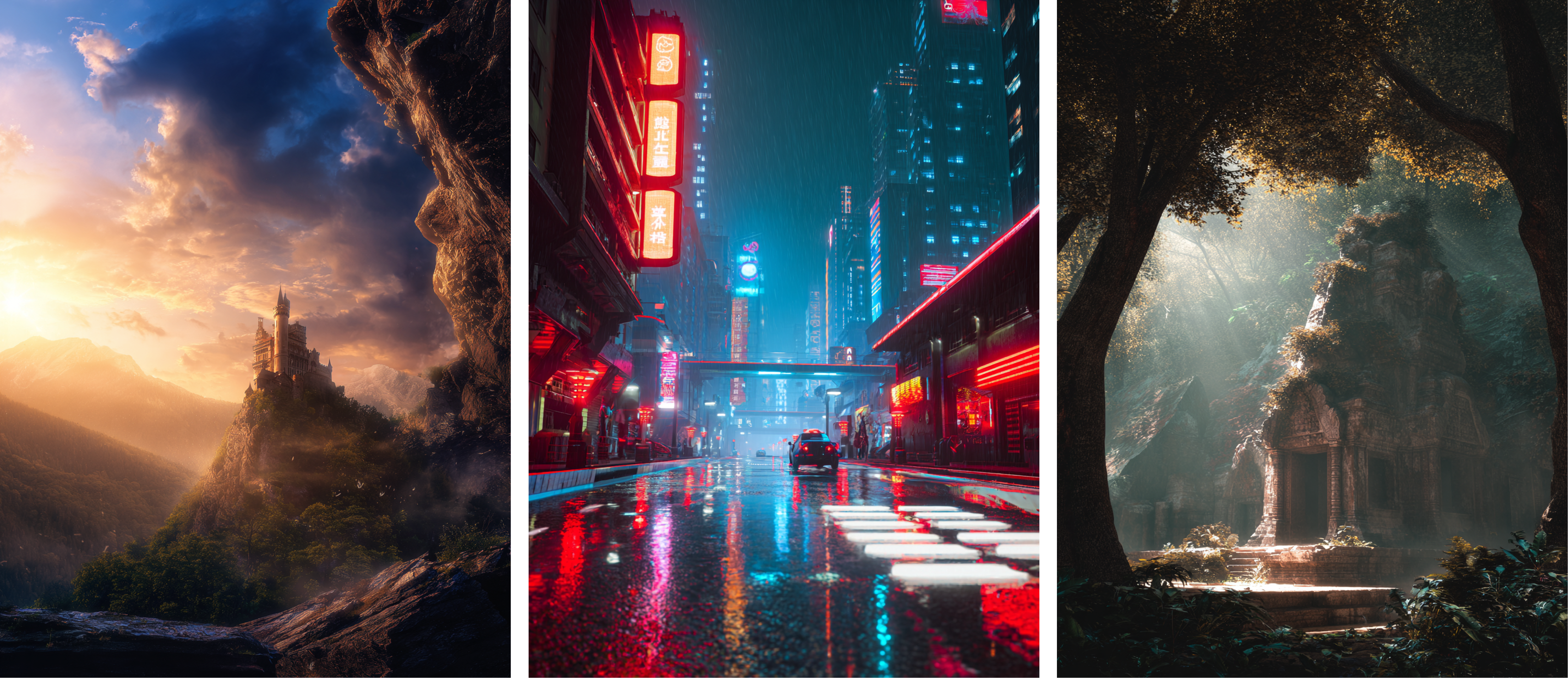 通过这些提示词,您能够创作出视觉效果丰富且极具质感的场景,呈现出如同电影大片或游戏环境般的精美画面。