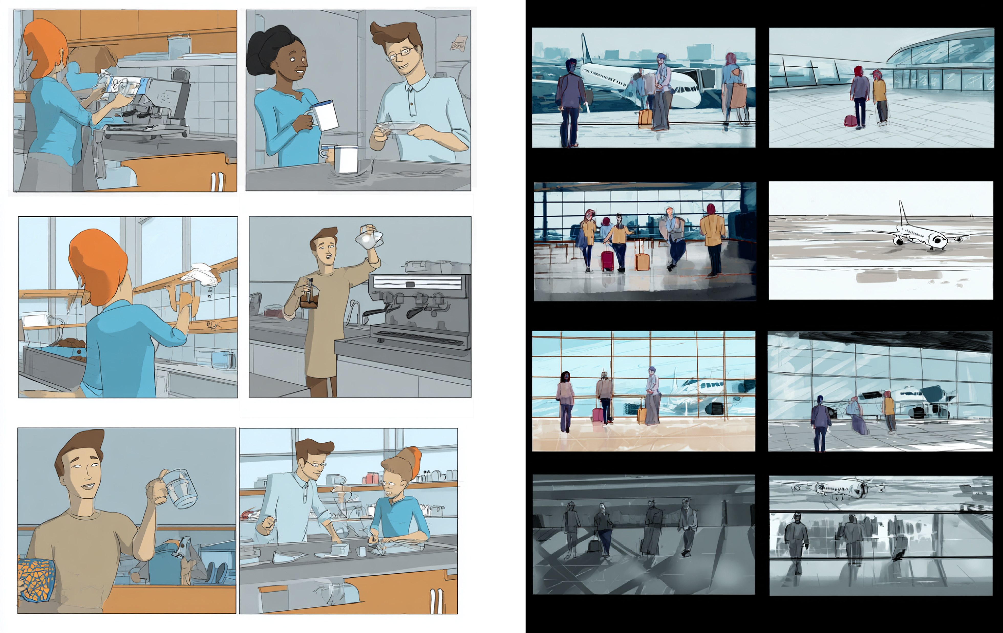采用电影化的多格分镜构图,生动呈现旅客抵达机场的故事板序列。